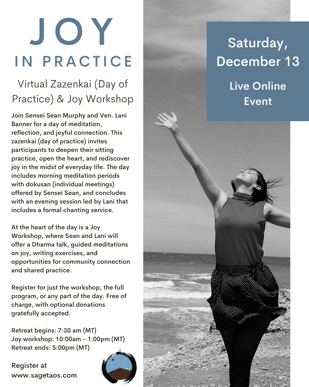 At the heart of the day is a Joy Workshop (10 am - 1 pm Mountain Time), where Sean and Lani will offer a Dharma talk, guided meditations on joy, and opportunities for shared practice and community connection.